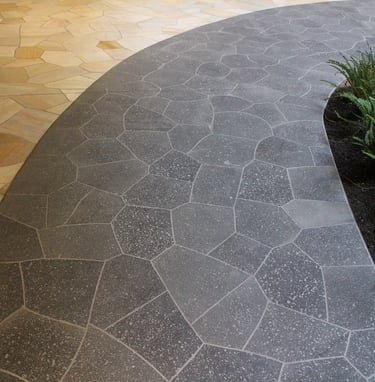 In the heart of the development, quartzite flagstones pave the pedestrian pathways in a bespoke blend of golden amber, ocean green, and slate blue. This hand-selected mix reflects the vibrant, sun-drenched atmosphere of the Hawaiian landscape, while adding depth and tonal variety underfoot.
